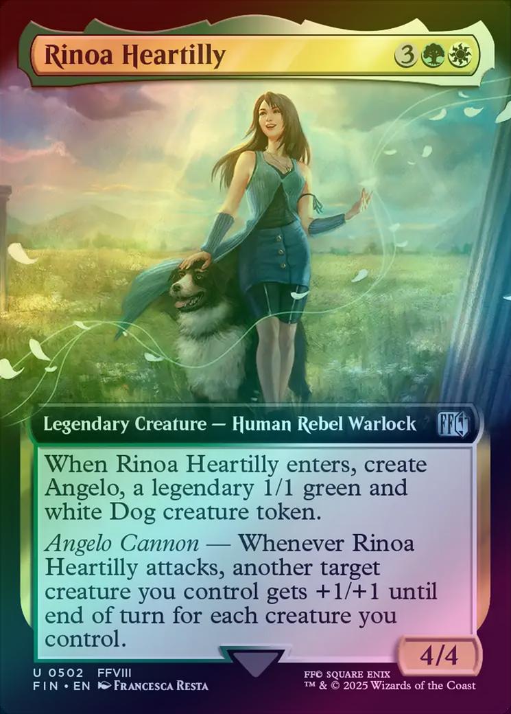 Rinoa HeartillyCasting Cost: Card Type: Legendary Creature - Human Rebel WarlockPower/Toughness: 4/4Card Text: When Rinoa Heartilly enters, create Angelo, a legendary 1/1 green and white Dog creature token. Angelo Cannon - Whenever Rinoa Heartilly attacks, another target creature you control gets +1/+1 until end of turn for each creature you control.Artist: Francesca Resta