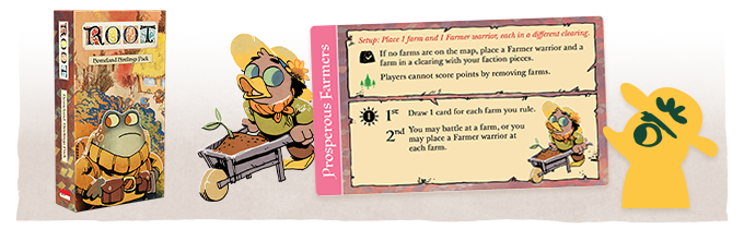 Three new hirelings enter the fray: the River Roamers, Sunny Advocates, and the neutral Prosperous Farmers. Each comes with a double-sided tarot card and new meeples, adding even more variety to your games of Root.