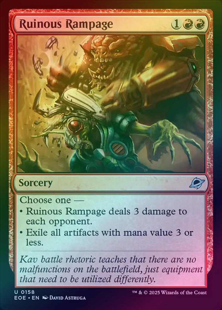 Ruinous RampageCasting Cost: Card Type: SorceryCard Text: Choose one - - Ruinous Rampage deals 3 damage to each opponent. - Exile all artifacts with mana value 3 or less.Flavour Text: Kav battle rhetoric teaches that there are no malfunctions on the battlefield, just equipment that need to be utilized differently.Artist: David Astruga