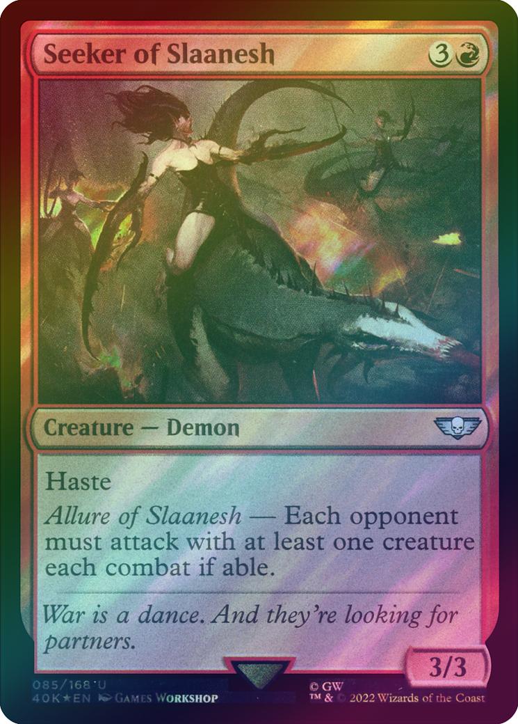 Seeker of SlaaneshCasting Cost: Card Type: Creature - DemonPower/Toughness: 3/3Card Text: Haste Allure of Slaanesh - Each opponent must attack with at least one creature each combat if able.Flavour Text: War is a dance. And they're looking for partners.Artist: Games Workshop