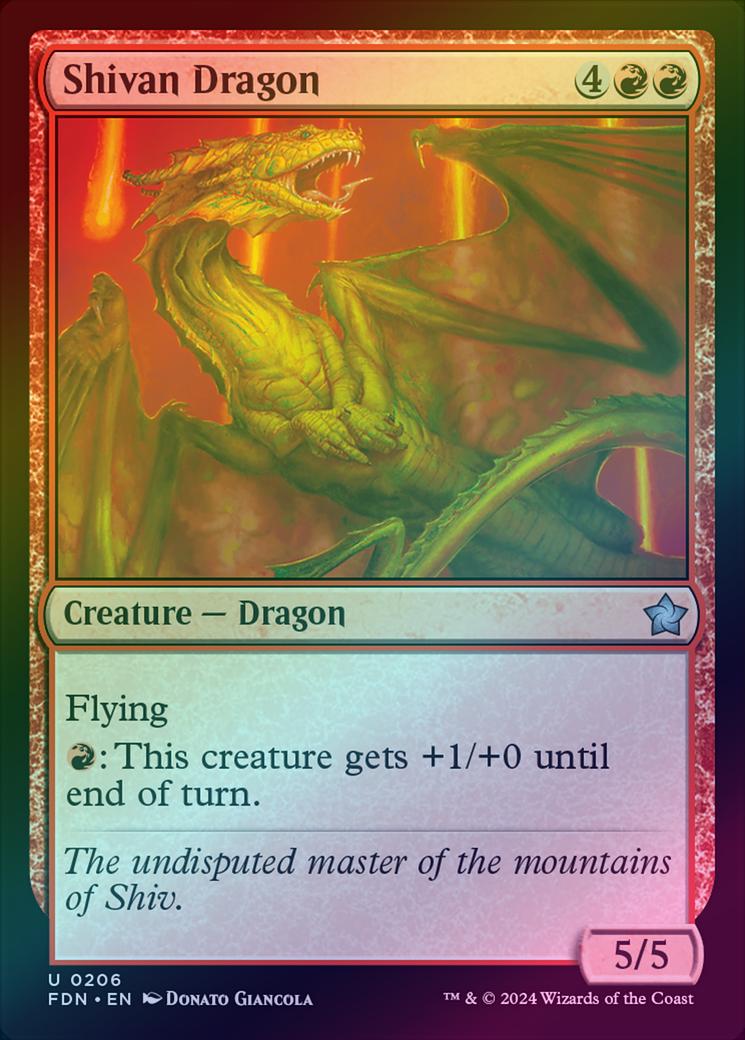 Shivan DragonCasting Cost: Card Type: Creature - DragonPower/Toughness: 5/5Card Text: Flying (This creature can't be blocked except by creatures with flying or reach.) : Shivan Dragon gets +1/+0 until end of turn.Flavour Text: The undisputed master of the mountains of Shiv.Artist: Donato Giancola
