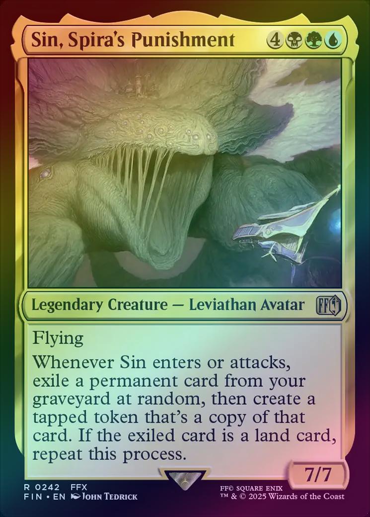 Sin, Spira's PunishmentCasting Cost: Card Type: Legendary Creature - Leviathan AvatarPower/Toughness: 7/7Card Text: Flying Whenever Sin enters or attacks, exile a permanent card from your graveyard at random, then create a tapped token that's a copy of that card. If the exiled card is a land card, repeat this process.Artist: John Tedrick