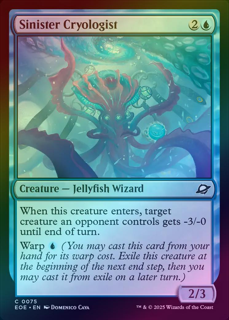 Sinister CryologistCasting Cost: Card Type: Creature - Jellyfish WizardPower/Toughness: 2/3Card Text: When this creature enters, target creature an opponent controls gets -3/-0 until end of turn. Warp (You may cast this card from your hand for its warp cost. Exile this creature at the beginning of the next end step, then you may cast it from exile on a later turn.)Artist: Domenico Cava