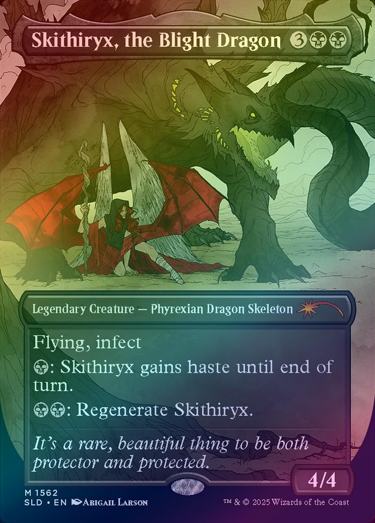 Skithiryx, the Blight DragonCasting Cost: Card Type: Legendary Creature - Phyrexian Dragon SkeletonPower/Toughness: 4/4Card Text: Flying Infect (This creature deals damage to creatures in the form of -1/-1 counters and to players in the form of poison counters.) : Skithiryx gains haste until end of turn. : Regenerate Skithiryx.Flavour Text: It's a rare, beautiful thing to be both protector and protected.Artist: Abigail Larson