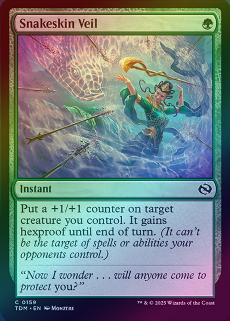 Snakeskin VeilCasting Cost: Card Type: InstantCard Text: Put a +1/+1 counter on target creature you control. It gains hexproof until end of turn. (It can't be the target of spells or abilities your opponents control.)Flavour Text: "Now I wonder . . . will anyone come to protect *you*?"Artist: Monztre