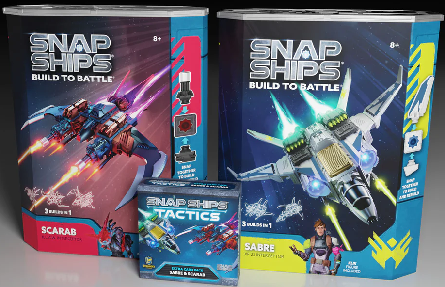 Extra copies of the ships in the Starter Box but in their original paint look and packaging. This pack includes a Sabre and a Scarab Snap Ships kit, which total 80+ building pieces between them. You also get the chassis, part, and AI cards for them, 51 cards total.