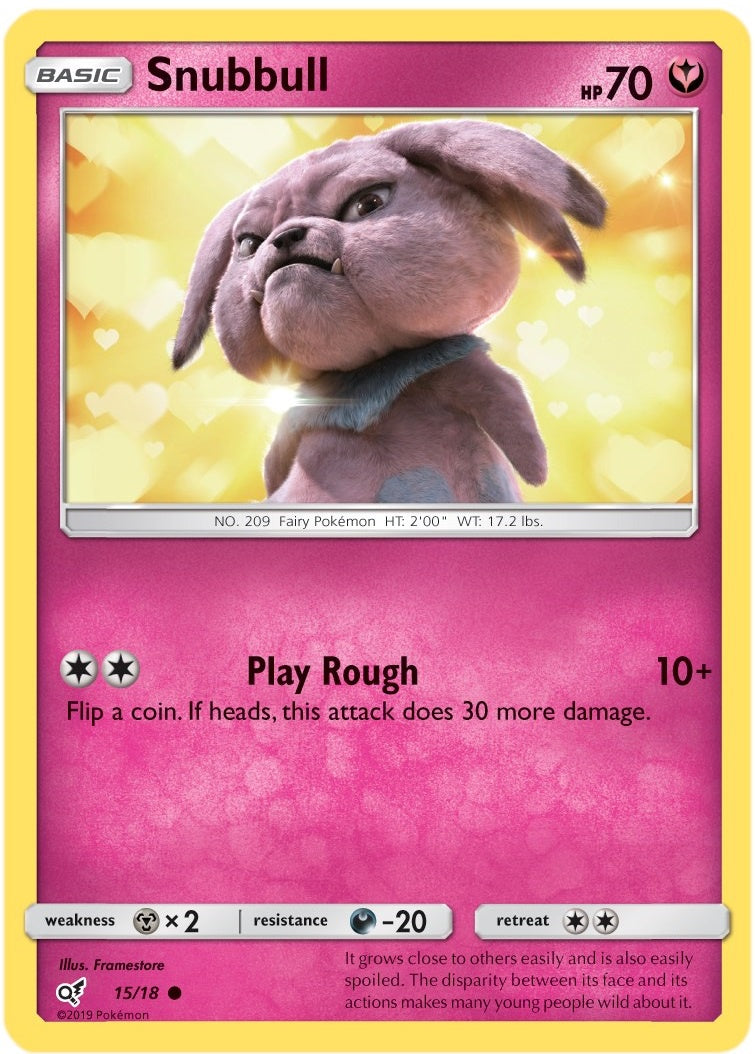 Snubbull - 15/18 - Common is available at 401 Games Canada! You can find lots of other Pokemon Singles products as well as more great items from Detective Pikachu!