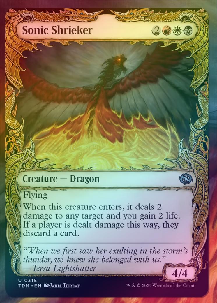 Sonic ShriekerCasting Cost: Card Type: Creature - DragonPower/Toughness: 4/4Card Text: Flying When this creature enters, it deals 2 damage to any target and you gain 2 life. If a player is dealt damage this way, they discard a card.Flavour Text: "When we first saw her exulting in the storm's thunder, we knew she belonged with us." -Tersa LightshatterArtist: Jarel Threat