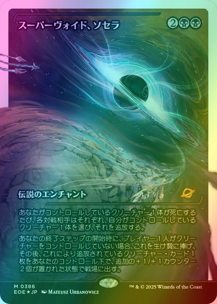 Sothera, the SupervoidCasting Cost: Card Type: Legendary EnchantmentCard Text: Whenever a creature you control dies, each opponent chooses a creature they control and exiles it. At the beginning of your end step, if a player controls no creatures, sacrifice Sothera, then put a creature card exiled with it onto the battlefield under your control with two additional +1/+1 counters on it.Artist: Mateusz Urbanowicz