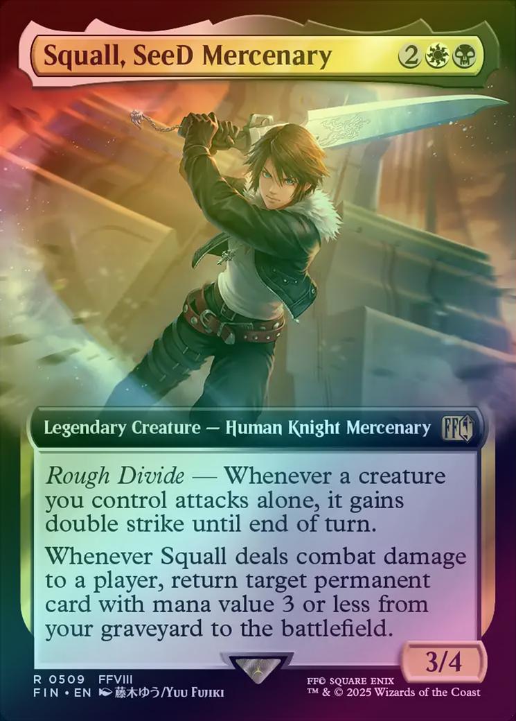 Squall, SeeD MercenaryCasting Cost: Card Type: Legendary Creature - Human Knight MercenaryPower/Toughness: 3/4Card Text: Rough Divide - Whenever a creature you control attacks alone, it gains double strike until end of turn. Whenever Squall deals combat damage to a player, return target permanent card with mana value 3 or less from your graveyard to the battlefield.Artist: Yuu Fujiki