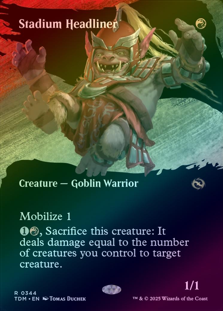 Stadium HeadlinerCasting Cost: Card Type: Creature - Goblin WarriorPower/Toughness: 1/1Card Text: Mobilize 1 (Whenever this creature attacks, create a tapped and attacking 1/1 red Warrior creature token. Sacrifice it at the beginning of the next end step.) , Sacrifice this creature: It deals damage equal to the number of creatures you control to target creature.Artist: Tomas Duchek