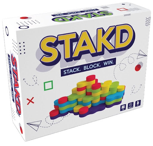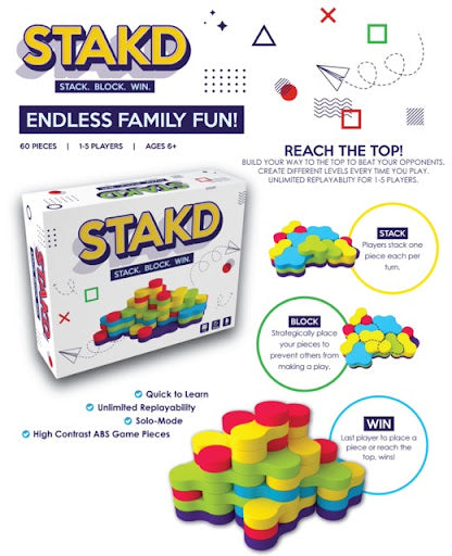 Stakd is a strategic stacking game played in rounds. Each round, players stack pieces to build the game (or block their opponents) until no more pieces can be added. The last person to lay a tile wins the round. The first player to win 3 rounds wins the game. But be careful! If you can't lay a tile, you're out for the round!