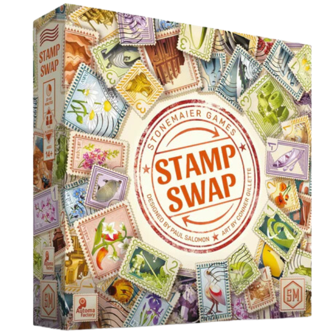 Designer Paul Salomon (Honey Buzz, Genotype) brings stamp collecting to life on tabletops in Stamp Swap! Draft from a public pool of face-down and face-up tiles (along with some bonus cards), then simultaneously divide them into 2 groups. You will select one group from another player and keep the group of yours that isn't selected. Organize your growing collection each round and score 1 of 4 goals — choose wisely, as you can't score that goal again.