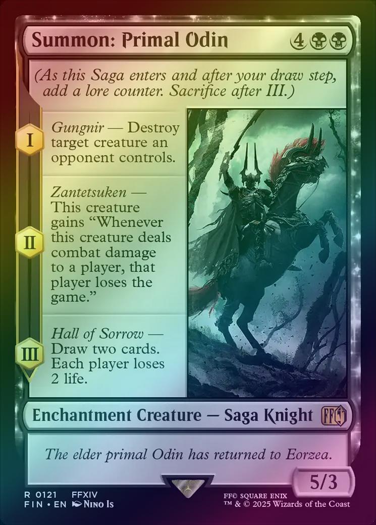 Summon: Primal OdinCasting Cost: Card Type: Enchantment Creature - Saga KnightPower/Toughness: 5/3Card Text: (As this Saga enters and after your draw step, add a lore counter. Sacrifice after III.) I - Gungnir - Destroy target creature an opponent controls. II - Zantetsuken - This creature gains "Whenever this creature deals combat damage to a player, that player loses the game." III - Hall of Sorrow - Draw two cards. Each player loses 2 life.Flavour Text: The elder primal Odin has returned to Eorzea.Artist: Nino Is
