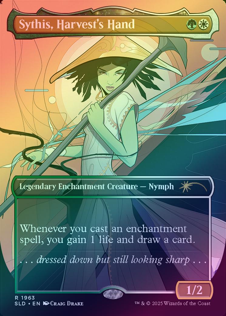 Sythis, Harvest's HandCasting Cost: Card Type: Legendary Enchantment Creature - NymphPower/Toughness: 1/2Card Text: Whenever you cast an enchantment spell, you gain 1 life and draw a card.Flavour Text: ...dressed down but still looking sharp...Artist: Craig Drake