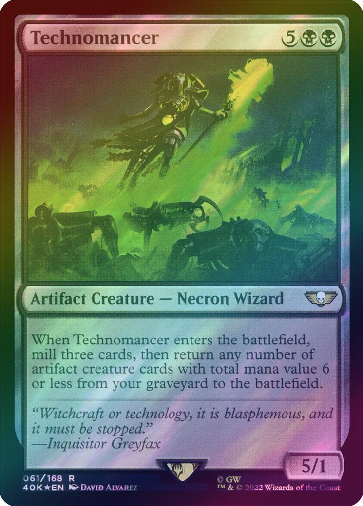 TechnomancerCasting Cost: Card Type: Artifact Creature - Necron WizardPower/Toughness: 5/1Card Text: When this creature enters, mill three cards, then return any number of artifact creature cards with total mana value 6 or less from your graveyard to the battlefield.Flavour Text: "Witchcraft or technology, it is blasphemous, and it must be stopped." -Inquisitor GreyfaxArtist: David lvarez