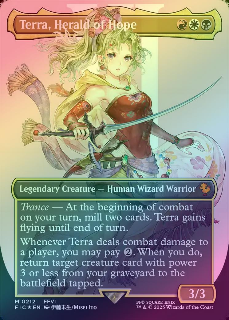 Terra, Herald of HopeCasting Cost: Card Type: Legendary Creature - Human Wizard WarriorPower/Toughness: 3/3Card Text: Trance - At the beginning of combat on your turn, mill two cards. Terra gains flying until end of turn. Whenever Terra deals combat damage to a player, you may pay . When you do, return target creature card with power 3 or less from your graveyard to the battlefield tapped.Artist: Misei Ito