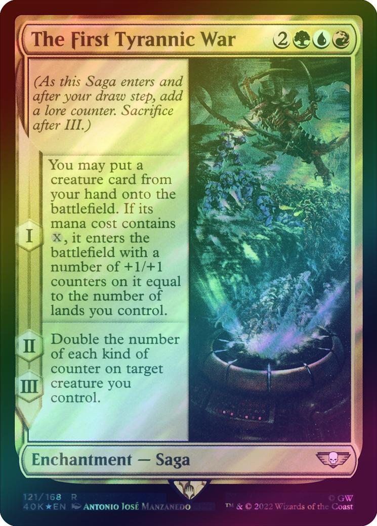 The First Tyrannic WarCasting Cost: Card Type: Enchantment - SagaCard Text: (As this Saga enters and after your draw step, add a lore counter. Sacrifice after III.) I - You may put a creature card from your hand onto the battlefield. If its mana cost contains , it enters with a number of +1/+1 counters on it equal to the number of lands you control. II, III - Double the number of each kind of counter on target creature you control.Artist: Antonio Jos Manzanedo