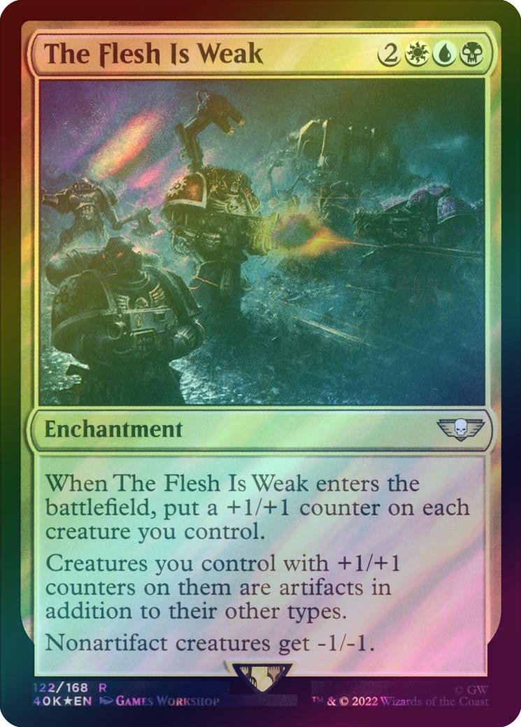 The Flesh Is WeakCasting Cost: Card Type: EnchantmentCard Text: When this enchantment enters, put a +1/+1 counter on each creature you control. Creatures you control with +1/+1 counters on them are artifacts in addition to their other types. Nonartifact creatures get -1/-1.Artist: Games Workshop