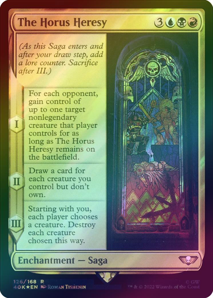 The Horus HeresyCasting Cost: Card Type: Enchantment - SagaCard Text: (As this Saga enters and after your draw step, add a lore counter. Sacrifice after III.) I - For each opponent, gain control of up to one target nonlegendary creature that player controls for as long as this Saga remains on the battlefield. II - Draw a card for each creature you control but don't own. III - Starting with you, each player chooses a creature. Destroy each creature chosen this way.Artist: Roman Tishenin