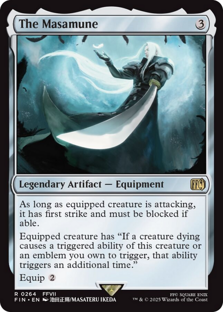 The MasamuneCasting Cost: Card Type: Legendary Artifact - EquipmentCard Text: As long as equipped creature is attacking, it has first strike and must be blocked if able. Equipped creature has "If a creature dying causes a triggered ability of this creature or an emblem you own to trigger, that ability triggers an additional time." Equip Artist: Masateru Ikeda