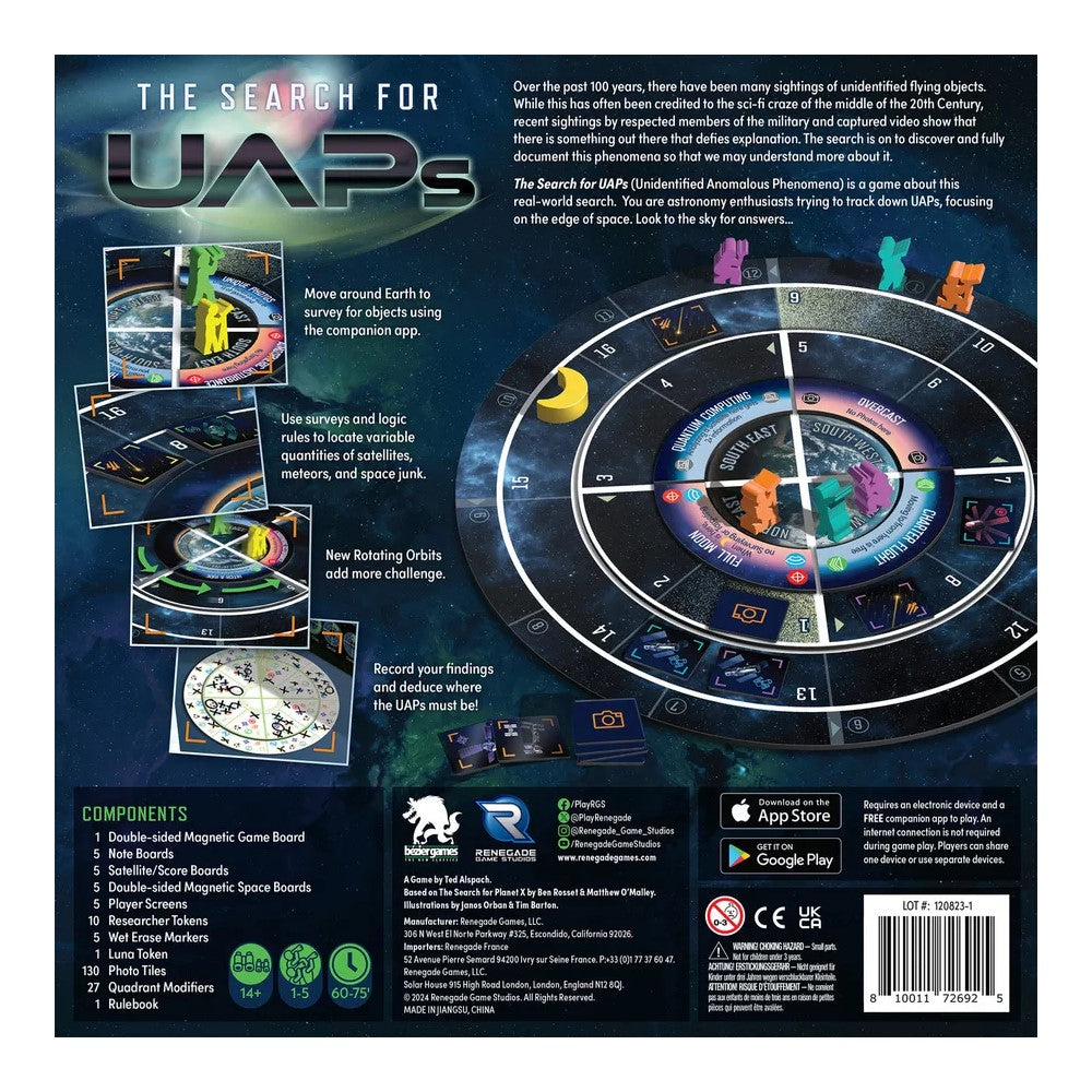 Deduction fans will enjoy new gameplay elements such as variable quantities of objects, analyzing satellites, and major new twists, such as rotating orbits that result in continually changing placement and adjacency. Objects can be next to something, above it, below it, in the same quadrant from it, or even directly across from it. As the Earth rotates, the options continue to expand! Search for and take pictures of satellites, the International Space Station, or the Hubble Telescope to help you track down mysterious UAPs!