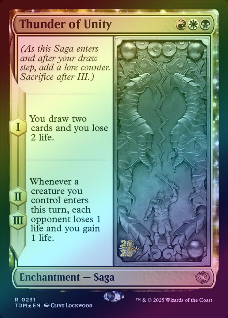 Thunder of UnityCasting Cost: Card Type: Enchantment - SagaCard Text: (As this Saga enters and after your draw step, add a lore counter. Sacrifice after III.) I - You draw two cards and you lose 2 life. II, III - Whenever a creature you control enters this turn, each opponent loses 1 life and you gain 1 life.Artist: Clint Lockwood