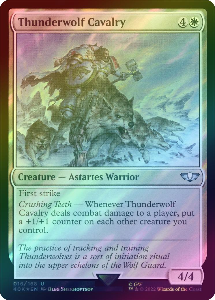 Thunderwolf CavalryCasting Cost: Card Type: Creature - Astartes WarriorPower/Toughness: 4/4Card Text: First strike Crushing Teeth - Whenever this creature deals combat damage to a player, put a +1/+1 counter on each other creature you control.Flavour Text: The practice of tracking and training Thunderwolves is a sort of initiation ritual into the upper echelons of the Wolf Guard.Artist: Oleg Shekhovtsov