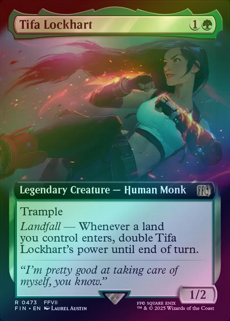 Tifa LockhartCasting Cost: Card Type: Legendary Creature - Human MonkPower/Toughness: 1/2Card Text: Trample Landfall - Whenever a land you control enters, double Tifa Lockhart's power until end of turn.Flavour Text: "I'm pretty good at taking care of myself, you know."Artist: Laurel Austin
