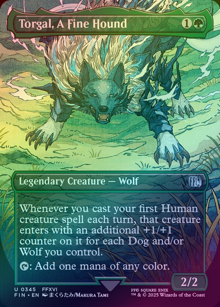 Torgal, A Fine HoundCasting Cost: Card Type: Legendary Creature - WolfPower/Toughness: 2/2Card Text: Whenever you cast your first Human creature spell each turn, that creature enters with an additional +1/+1 counter on it for each Dog and/or Wolf you control. : Add one mana of any color.Artist: Makura Tami