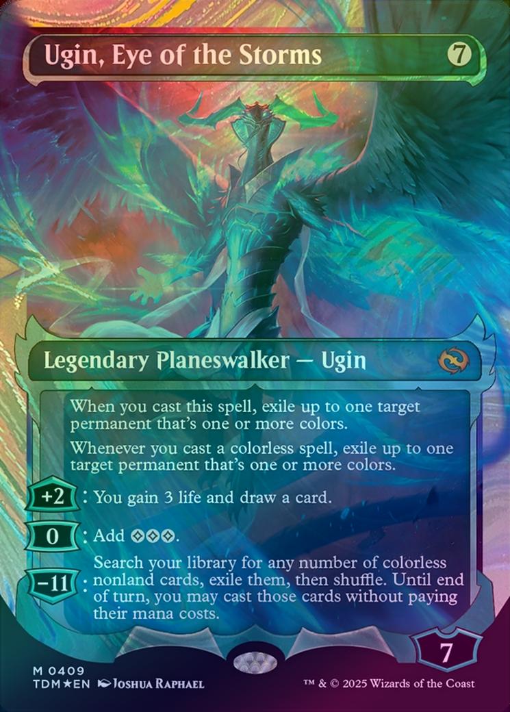 Ugin, Eye of the StormsCasting Cost: Card Type: Legendary Planeswalker - UginLoyalty: 7Card Text: When you cast this spell, exile up to one target permanent that's one or more colors. Whenever you cast a colorless spell, exile up to one target permanent that's one or more colors. +2: You gain 3 life and draw a card. 0: Add . -11: Search your library for any number of colorless nonland cards, exile them, then shuffle. Until end of turn, you may cast those cards without paying their mana costs.Artist: Joshua Raphael