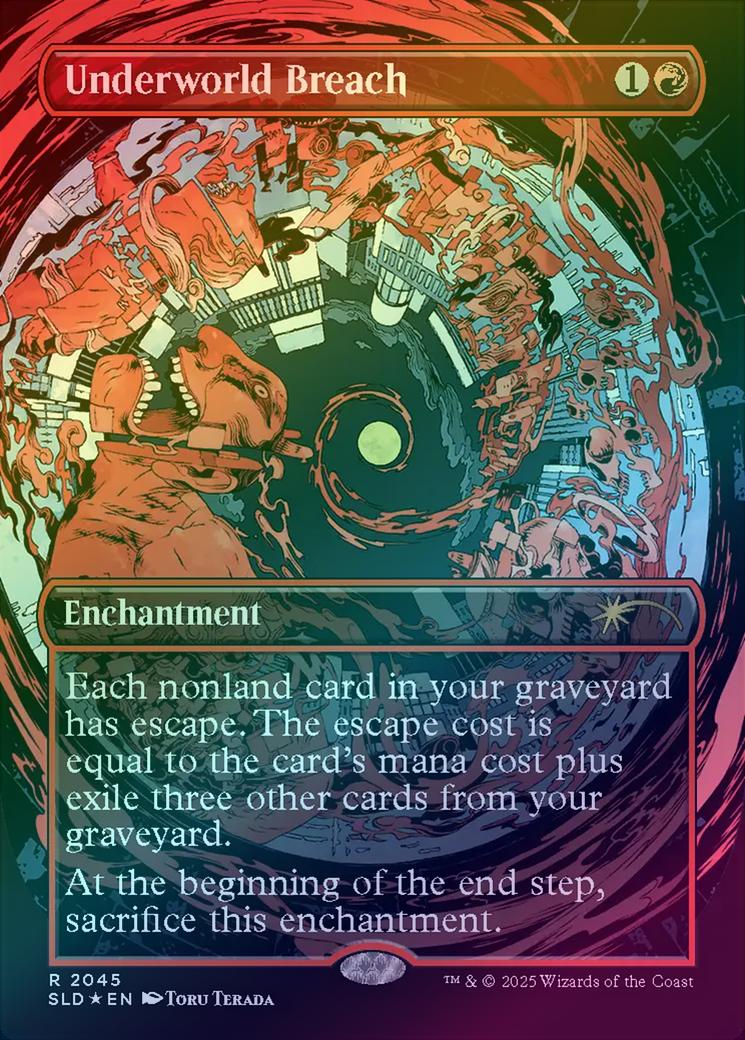 Underworld BreachCasting Cost: Card Type: EnchantmentCard Text: Each nonland card in your graveyard has escape. The escape cost is equal to the card's mana cost plus exile three other cards from your graveyard. (You may cast cards from your graveyard for their escape cost.) At the beginning of the end step, sacrifice this enchantment.Artist: Toru Terada