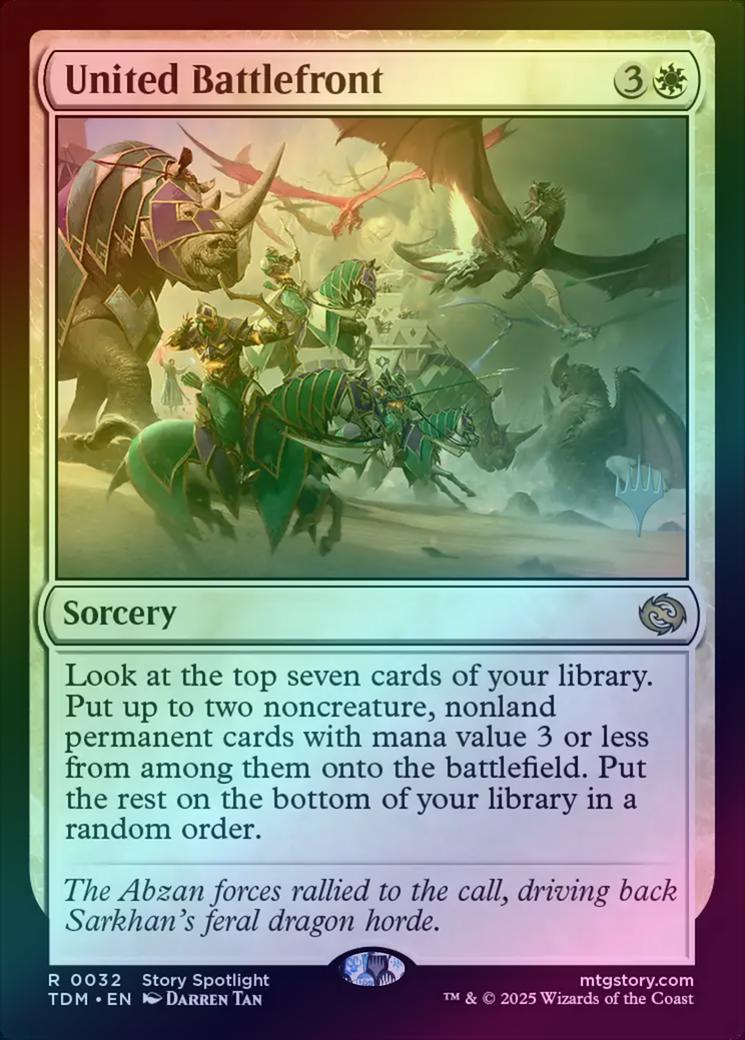 United BattlefrontCasting Cost: Card Type: SorceryCard Text: Look at the top seven cards of your library. Put up to two noncreature, nonland permanent cards with mana value 3 or less from among them onto the battlefield. Put the rest on the bottom of your library in a random order.Flavour Text: The Abzan forces rallied to the call, driving back Sarkhan's feral dragon horde.Artist: Darren Tan