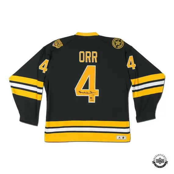 While most skaters want to put the puck in the back of the net, perhaps the most valuable statistic in hockey is assists. An assist not only shows unselfishness in a team sport that relies on it, it also shows great vision and understanding of the key moments of a game. Perhaps nobody grasped this concept more than Hall of Fame defenseman Bobby Orr. Playing for the Boston Bruins, he led the entire NHL in assists from his blueline position an incredible five times in the 1970s. He racked up 102 assists in the 1970-71 season, which is a record for defensemen that still stands today. Orr has autographed this Boston Bruins Heroes of Hockey authentic black jersey in black paint pen. His signature is deemed authentic by virtue of Upper Deck Authenticated’s Five-Step Process.