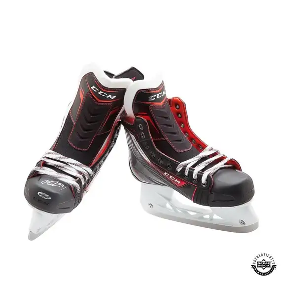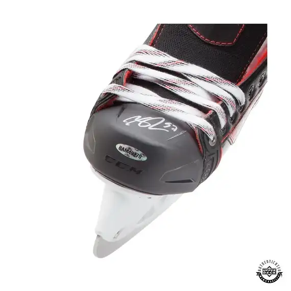The incredible talent Connor McDavid displayed in his abbreviated NHL rookie season of 2015-16 was obvious even to the casual hockey observer. What impressed people equally was his maturity and leadership. For those that know McDavid, that wasn't surprising. In his previous three seasons before his rookie campaign, he earned every award imaginable while with the Erie Otters of the OHL. Among his list of accomplishments was winning trophies for Rookie of the Year, Most Sportsmanlike Player, Scholastic Player of the Year and Most Outstanding Player. He lit up the scoreboard at that level and did the same thing with the Oilers, scoring 48 points in 45 games as a rookie. When he takes the ice, McDavid speeds up and down the arena in CCM JetSpeed skates, and now Upper Deck Authenticated is offering autographed pairs of the same style he wears. McDavid has autographed this pair of CCM JetSpeed skates in silver paint pen. His signature is deemed authentic by virtue of Upper Deck Authenticated's Five Step Process.