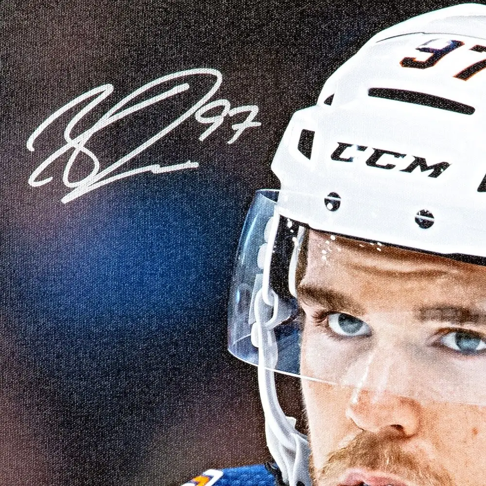 Connor McDavid was the Art Ross Trophy recipient of the 2016-2017 season, and the 2017-2018 season. He also was awarded the Ted Lindsay trophy in the 2016-2017 season, and the 2017-2018 season. Lastly, McDavid was awarded the Hart Memorial Trophy in the 2016-2017 season. At the beginning of the 2018-19 season, the Edmonton Oilers faced off against the New Jersey Devils for the 2018 NHL Global Series played in Europe. The game was played on Saturday, Oct. 6 in Gothenburg, Sweden. McDavid has autographed this stretched canvas showing him playing in the Global Series game in silver paint pen. Upper Deck Authenticated guarantees the authenticity of McDavid's signature on this item through its five-step authentication process. At the heart of the policy are the requirements that each signing be witnessed by an Upper Deck employee, and matching serially numbered holograms affixed to each signed item and its corresponding certificate of authenticity.