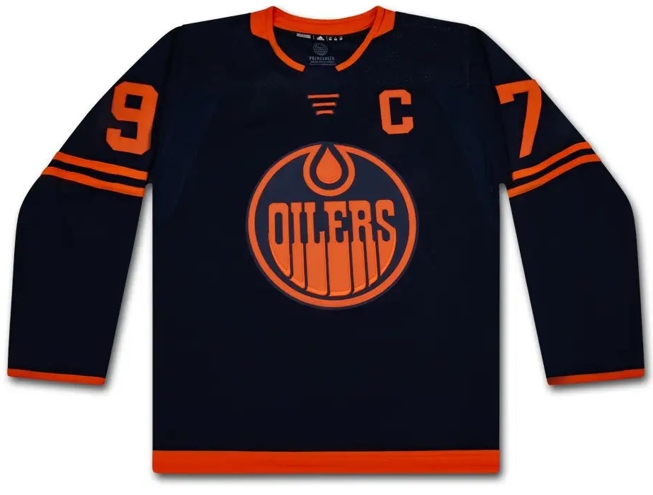 The Edmonton Oilers have worn several different variations of jerseys over the course of their franchise’s history but the team has most consistently relied on different variations of the classic royal blue and orange with a blend of white. To start the 2019-2020 season the Oilers unveiled their new alternate jersey, a darker navy blue with orange trim and lettering, removing all white from the jersey. The “ADIZERO” jersey was to be worn exclusively on Friday night home games and while the jerseys were met with some initial skepticism from traditionalists their popularity quickly shot up once fans saw how great they looked on ice. The team decided to keep the alternate jerseys after the 2019-2020 season and open it up to more than just Friday nights. The following season Connor McDavid would notch his 500th point on February 17th, 2021 wearing these navy blue alternate jerseys.