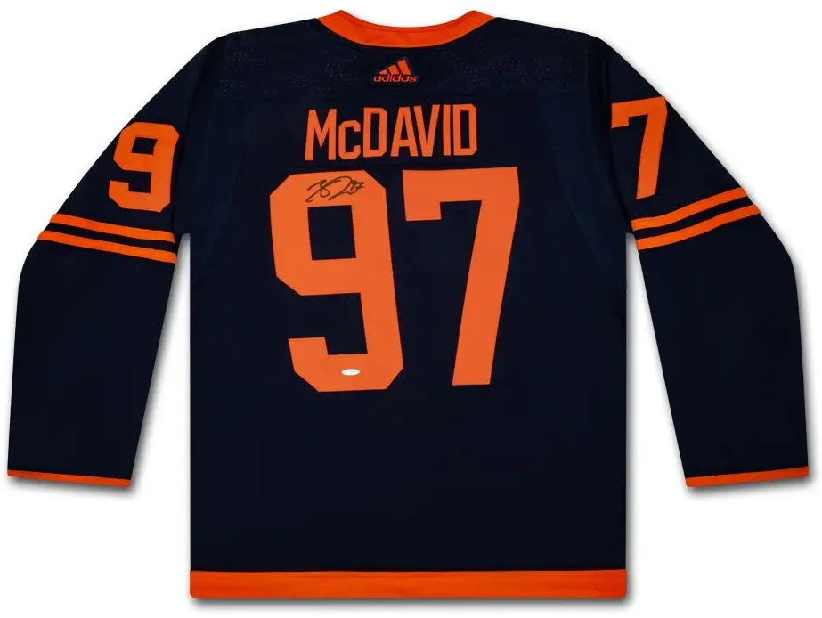This authentic navy primegreen Adidas Edmonton Oilers alternate jersey is autographed by Connor McDavid. McDavid’s signature was witnessed by an Upper Deck representative as part of UDA’s 5-step authentication process.