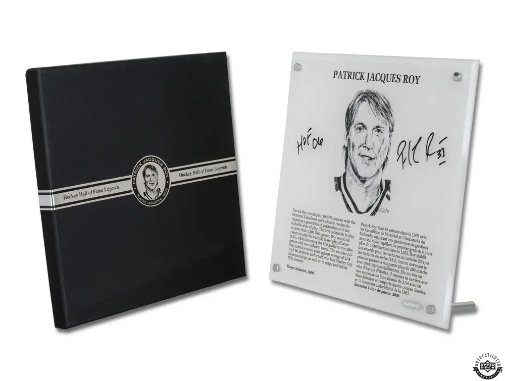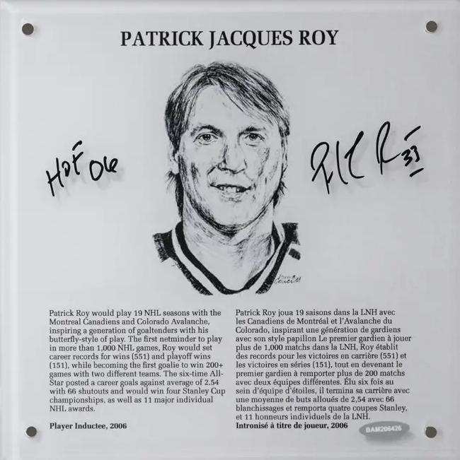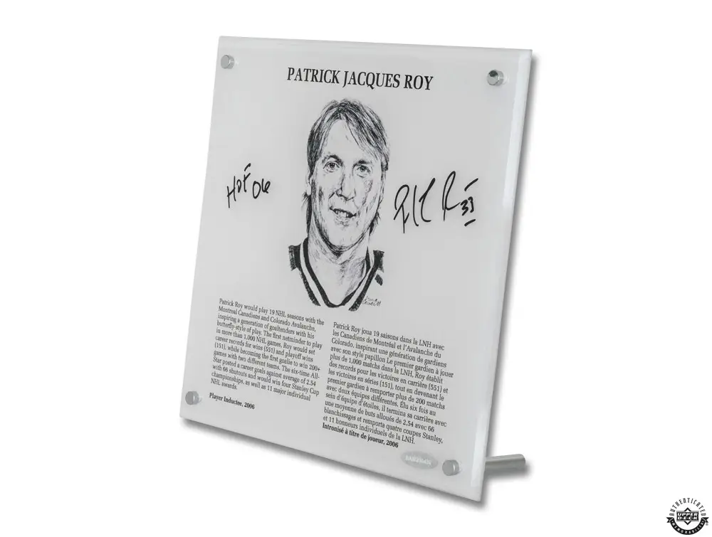 This plaque is autographed and inscribed “HOF 06” by Patrick Roy. Roy’s signature and inscription were witnessed by an Upper Deck representative as part of UDA’s 5-step authentication process. This plaque is not limited.