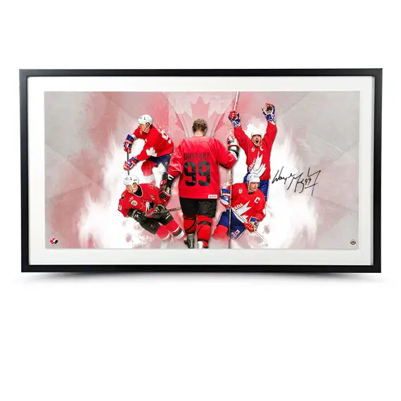 A native of Brantford, Ontario Wayne Gretzky is a hockey icon in his home country. Wayne was 16 years old when he first donned the National red and white sweater as member of the 1978 World Junior team. He was the youngest participant, but managed to lead the tournament in goals and was named an all star. His individual dominance continued as he grew older and the national team began to flourish. Gretzky played on four Canada Cup teams (1981, 1984, 1987, 1991) winning the gold medal three times. The 1998 Winter Olympics in Nagano, Japan were Wayne's eighth and last international competition as a member of the storied Canadian National Team. He left international play as the record holder in goals, assists, and most overall points in best on best hockey. This 36"x18" five image collage 'Homeland' pays homage to the greatest Canadian born hockey player ever. Wayne Gretzky has inked his name in black paint pen. We framed this image and it measures 40"x22". Gretzky's signature was witnessed under UDA's Five-Step Authentication Process.