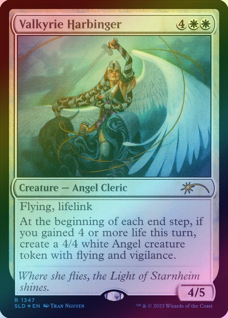 Valkyrie HarbingerCasting Cost: Card Type: Creature - Angel ClericPower/Toughness: 4/5Card Text: Flying Lifelink (Damage dealt by this creature also causes you to gain that much life.) At the beginning of each end step, if you gained 4 or more life this turn, create a 4/4 white Angel creature token with flying and vigilance.Flavour Text: Where she flies, the Light of Starnheim shines.Artist: Tran Nguyen