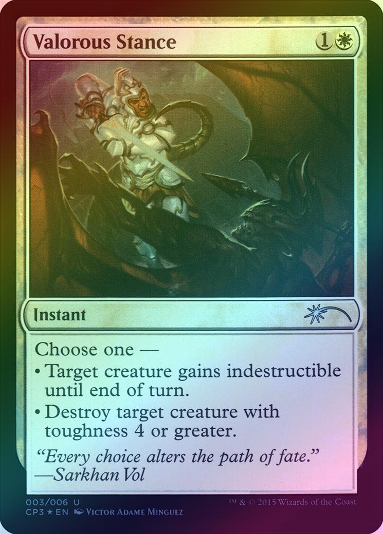 Valorous StanceCasting Cost: Card Type: InstantCard Text: Choose one - - Target creature gains indestructible until end of turn. (Damage and effects that say "destroy" don't destroy it.) - Destroy target creature with toughness 4 or greater.Flavour Text: "Every choice alters the path of fate." -Sarkhan VolArtist: Victor Adame Minguez