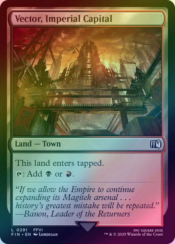 Vector, Imperial CapitalCard Type: Land - TownCard Text: This land enters tapped. : Add or .Flavour Text: "If we allow the Empire to continue expanding its Magitek arsenal... history's greatest mistake will be repeated." -Banon, Leader of the ReturnersArtist: Lordigan
