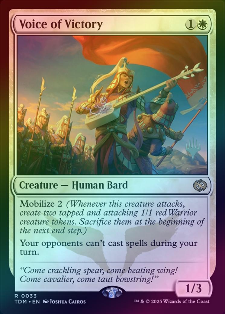 Voice of VictoryCasting Cost: Card Type: Creature - Human BardPower/Toughness: 1/3Card Text: Mobilize 2 (Whenever this creature attacks, create two tapped and attacking 1/1 red Warrior creature tokens. Sacrifice them at the beginning of the next end step.) Your opponents can't cast spells during your turn.Flavour Text: "Come crackling spear, come beating wing! Come cavalier, come taut bowstring!"Artist: Joshua Cairos