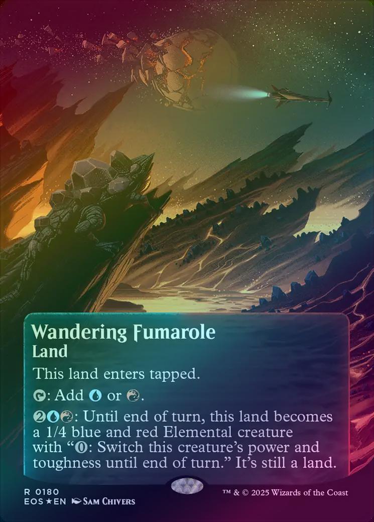 Wandering FumaroleCard Type: LandCard Text: This land enters tapped. : Add or . : Until end of turn, this land becomes a 1/4 blue and red Elemental creature with ": Switch this creature's power and toughness until end of turn." It's still a land.Artist: Sam Chivers