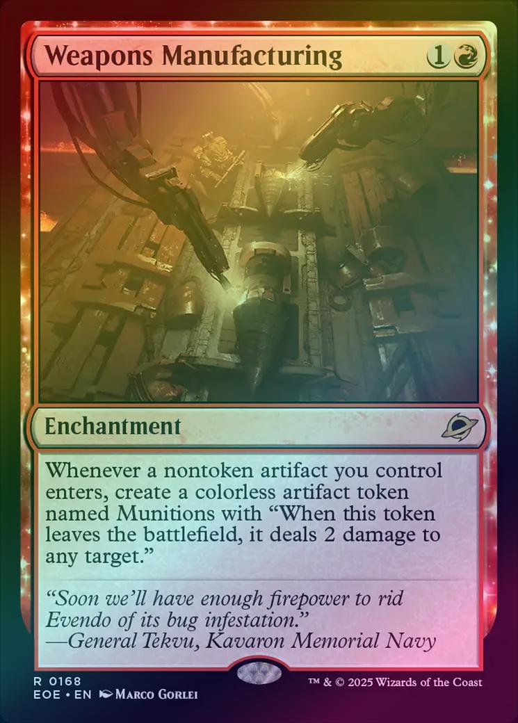 Weapons ManufacturingCasting Cost: Card Type: EnchantmentCard Text: Whenever a nontoken artifact you control enters, create a colorless artifact token named Munitions with "When this token leaves the battlefield, it deals 2 damage to any target."Flavour Text: "Soon we'll have enough firepower to rid Evendo of its bug infestation." -General Tekvu, Kavaron Memorial NavyArtist: Marco Gorlei