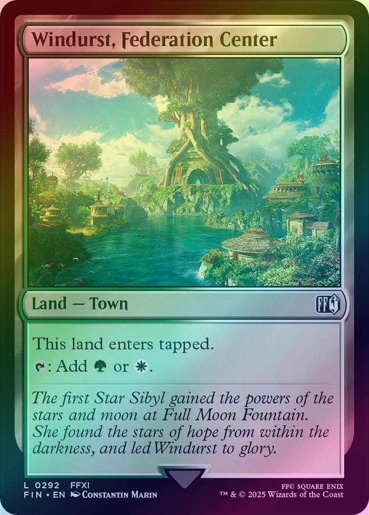Windurst, Federation CenterCard Type: Land - TownCard Text: This land enters tapped. : Add or .Flavour Text: The first Star Sibyl gained the powers of the stars and moon at Full Moon Fountain. She found the stars of hope from within the darkness, and led Windurst to glory.Artist: Constantin Marin