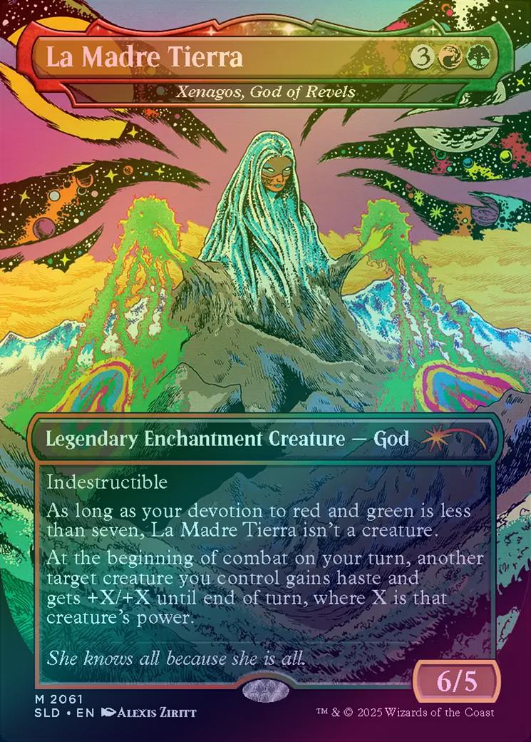 Xenagos, God of RevelsCasting Cost: Card Type: Legendary Enchantment Creature - GodPower/Toughness: 6/5Card Text: Indestructible As long as your devotion to red and green is less than seven, Xenagos isn't a creature. At the beginning of combat on your turn, another target creature you control gains haste and gets +X/+X until end of turn, where X is that creature's power.Artist: Alexis Ziritt