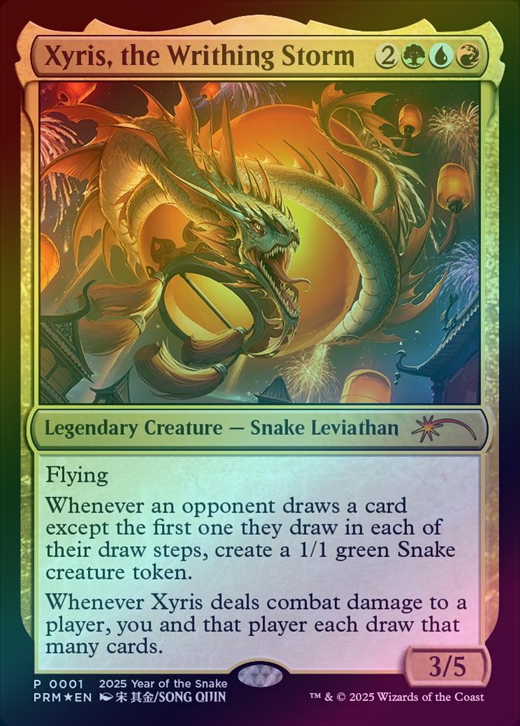 Xyris, the Writhing StormCasting Cost: Card Type: Legendary Creature - Snake LeviathanPower/Toughness: 3/5Card Text: Flying Whenever an opponent draws a card except the first one they draw in each of their draw steps, create a 1/1 green Snake creature token. Whenever Xyris deals combat damage to a player, you and that player each draw that many cards.Artist: Song Qijin