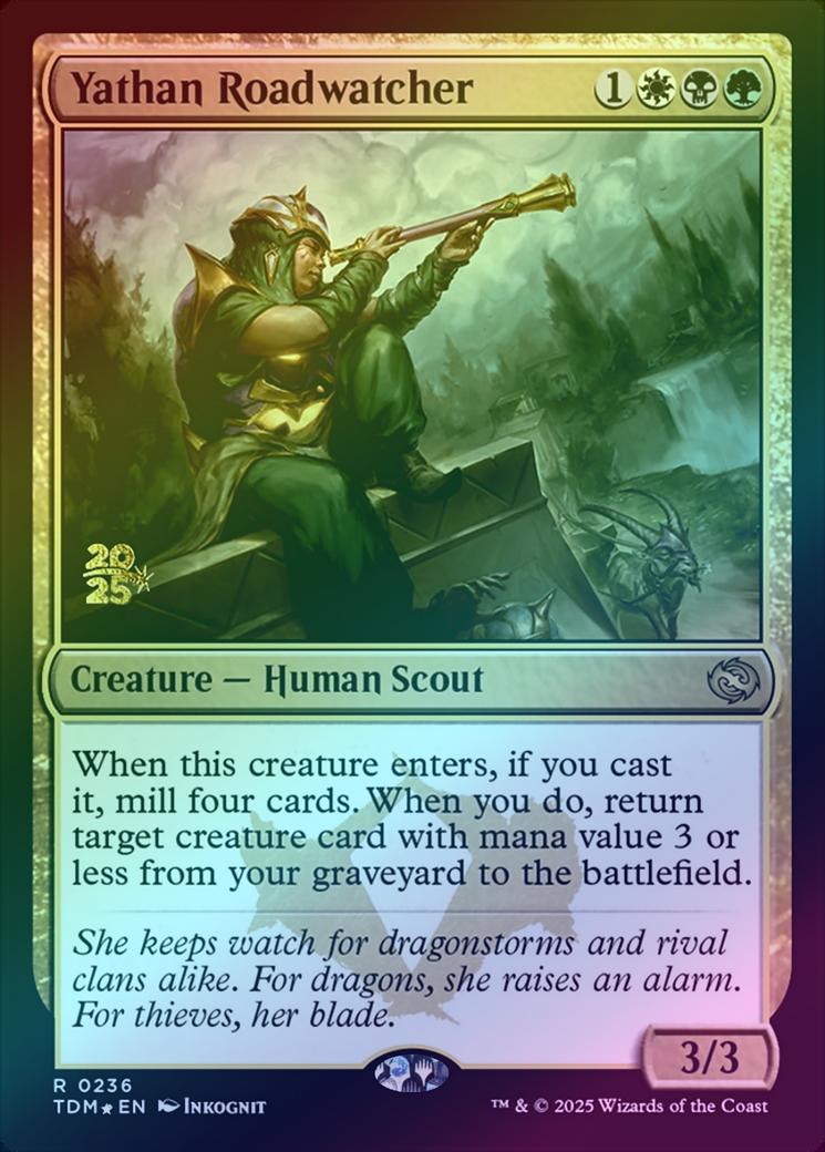 Yathan RoadwatcherCasting Cost: Card Type: Creature - Human ScoutPower/Toughness: 3/3Card Text: When this creature enters, if you cast it, mill four cards. When you do, return target creature card with mana value 3 or less from your graveyard to the battlefield.Flavour Text: She keeps watch for dragonstorms and rival clans alike. For dragons, she raises an alarm. For thieves, her blade.Artist: Inkognit